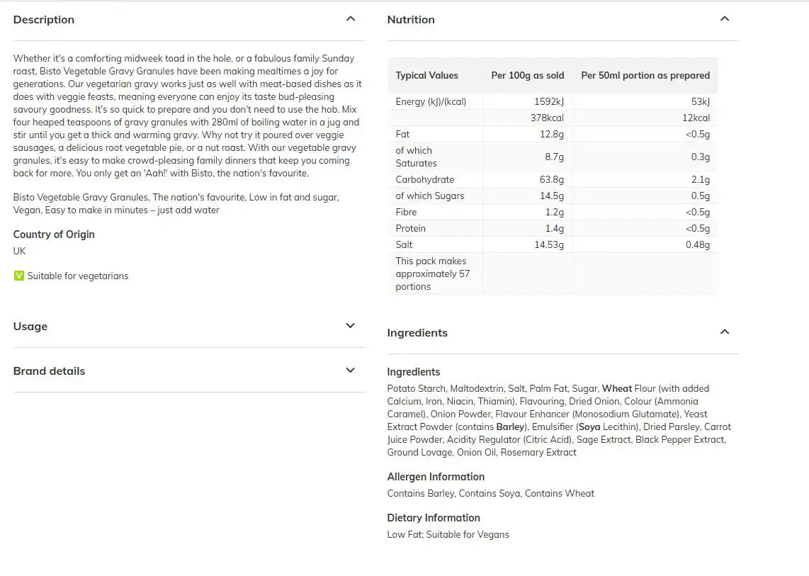 Craving authentic British flavors right here in the USA? Look no further! British Food Supplies brings you the taste of home with our premium selection of imported UK groceries, including the ever-popular Bisto Vegetable Gravy Granules. Forget bland imitationsthese are the real deal, shipped directly from the UK and delivered fresh from our US warehouse straight to your doorstep. British Food Supplies understands your desire for genuine British food, and we're committed to providing you with the highest quality products.These Bisto Vegetable Gravy Granules 190g are a cornerstone of British cuisine, loved for their ease of use and unbeatable flavor. Made with a secret blend of herbs and spices, these vegetarian gravy granules are the perfect way to elevate any meal. Whether you're creating a classic Sunday roast, a hearty shepherd's pie, or simply want to add a touch of richness to your mashed potatoes, Bisto is the answer.Imagine the comforting aroma of a home-cooked British meal filling your kitchen. With Bisto, that dream becomes a reality. These aren't just gravy granules; they're a taste of nostalgia, a connection to your roots, and a guaranteed crowd-pleaser. Perfect for expats missing home comforts or Americans looking to experience the authentic flavors of Britain.Using these granules is incredibly simple. Just add a spoonful to boiling water, stir, and watch as a rich, flavorful gravy instantly appears. Adjust the amount to achieve your desired consistencythick and luscious or light and drizzly. The possibilities are endless! Drizzle over Yorkshire puddings, pour over sausages and mash, or simply enjoy with a side of roasted vegetables. Bisto adds that quintessential British touch to any dish.